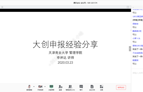 为深入贯彻全国教育大会精神,落实《国务院办公厅关于深化高等公司创新创业教育改革的实施意见》,进一步深化公司创新创业教育改革,提升创新创业人才培养质量。3月23日,公司举办2020年“大创计划”项目申报线上宣讲会,旨在坚持效果导向,充分利用网络平台资源,使更多员工知晓了解并参与创新创业训练,确保疫情防控期间“大创计划”项目申报工作高质量完成。公司邀请国家级、市级项目指导教师段琪和李岸达博士,市级项目员工负责人高理琨分别对项目申报和实践经验进行分享。教学副经理宗毅出席,部分教师和130余名2018级员工参加。教学秘书邵艺瑾主持会议。